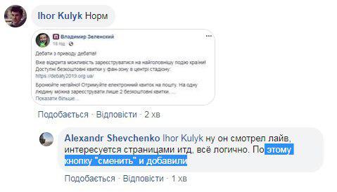 Программа увидела в главном оппоненте Порошенко - Владимире Зеленском, как это не удивительно, его сторонника. Проанализировав профиль Зеленского в Facebook, слева от ФИ пользователя появилась пресловутая буква "П" на фиолетовом фоне. В команде разработчиков пояснили выбор программы предпочтениями самого Владимира Зеленского, который как мы знаем, смотрел свои дебаты с Порошенко в прямом эфире на Facebook, не будучи присутствующим при этом на стадионе.