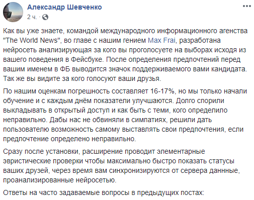 По словам Шевченко, после определения предпочтений перед именем пользователя в соцсети выводится значок поддерживаемого кандидата. Также благодаря приложению можно увидеть, за кого проголосуют ваши друзья в соцсети. Впрочем, разработчики предупреждают, что погрешность оценок может составлять 16-17%. Чтобы исправить ошибку пользователь может и сам выставлять свои предпочтения "вручную".