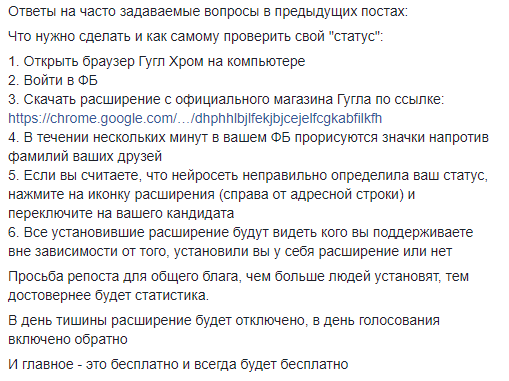 Таким образом, из-за явно противоречащих результатов которые выдает программа, можно предположить, что создана она скорее с развлекательной целью. Разработчики сообщают, что чем больше людей установят приложение, тем достовернее будет статистика. В день тишины расширение будет отключено, в день голосования включено обратно.