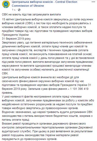 С соответствующим письмом Центризбирком обратился к главам окружкомов 15 апреля. Речь идет об оплате труда членов комиссий и привлеченных специалистов, экспертов и технических работников. Эти выплаты - исключительная компетенция окружкомов, ЦИК сделал все необходимое для своевременного финансирования комиссий во время подготовки и проведения выборов. Общая сумма финансирования - 1 191 396 419 гривен.