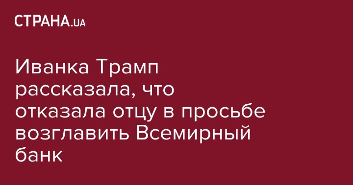 Иванка Трамп подтвердила, что ее отец, президент США Дональд Трамп действительно предлагал ей возглавить "Всемирный банк" (ВБ), если бы ее заинтересовала эта работа. Иванка Трамп в ответ на это предложение сказала отцу, что вполне счастлива своей должностью советника Белого дома.
