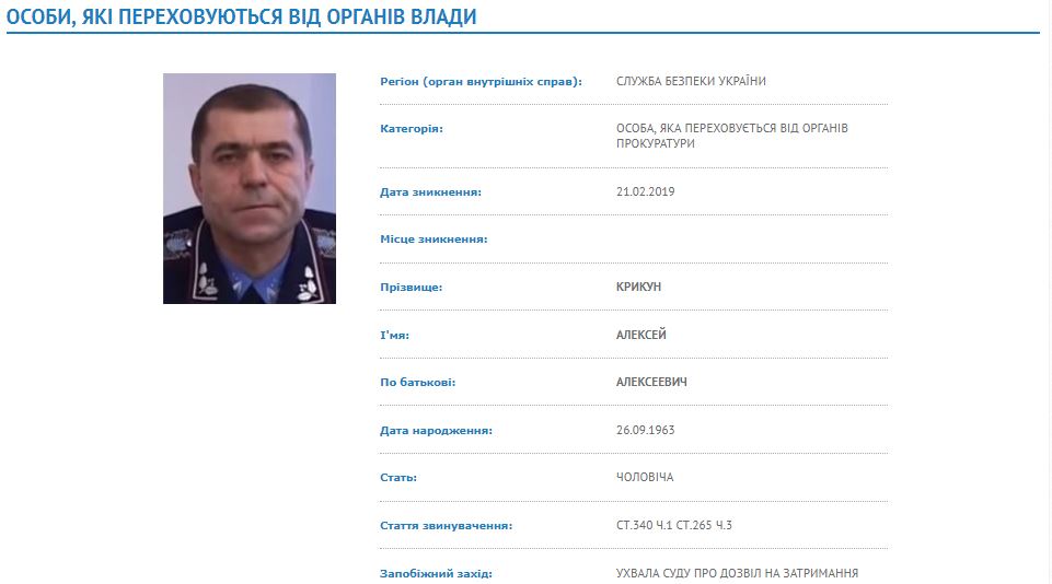 Указано, что Крикун скрывается от прокуратуры и разыскивается СБУ. Он исчез из поля зрения украинских правоохранителей 21 февраля текущего года. Ему предъявлено подозрение по статье "незаконное воспрепятствование организации или проведению собраний, митингов, шествий и демонстраций" и "приобретение, ношение, хранение, использование, передача, видоизменение, уничтожение, распыление или разрушение радиоактивных материалов (источников ионизирующего излучения, радиоактивных веществ или ядерных материалов) без предусмотренного законом разрешения) Уголовного кодекса. Получено разрешение суда на задержание генерала. Правоохранители считают Крикуна причастным к разгону Майдана.