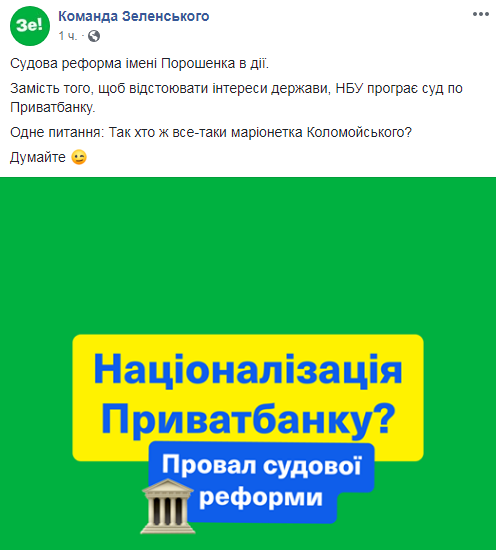 "Судебная реформа имени Порошенко в действии. Вместо того чтобы отстаивать интересы государства, НБУ проигрывает суд ПриватБанку. Один вопрос: так, кто же все-таки, марионетка Коломойского? Думайте", - говорится в фб-сообщении команды Зеленского.