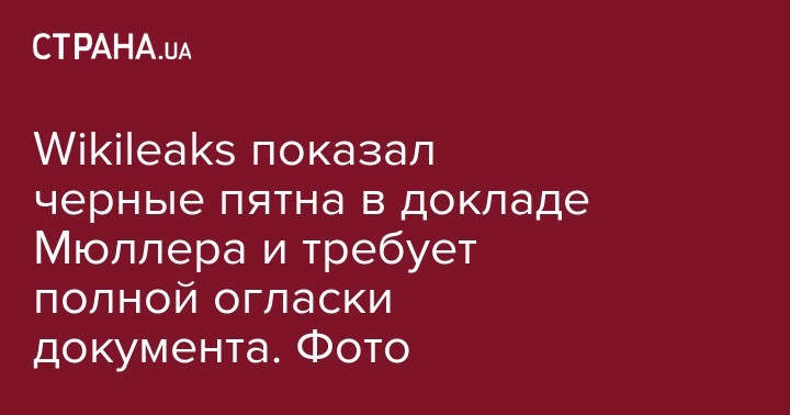 После того, как Минюст США 18 апреля опубликовал доклад спецпрокурора Мюллера о вмешательстве России в выборы 2016 года, портал Wikileaks заявил, что документ содержит значительные купюры и призвал власти обнародовать полную версию отчета спецпрокурора.