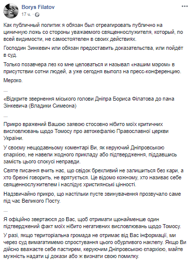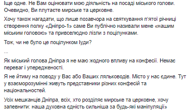 Только позавчера лез ко мне целоваться и называл "нашим мэром" в присутствии сотни людей, а уже сегодня выполз на пресс-конференцию. Мерзко", написал мэр Днепра на своей стрнице в соцсети и опубликовал открытое обращение к священнослужителю.