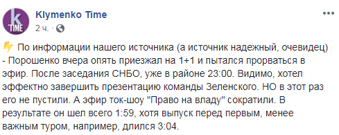 Отметим, что ранее данные о попытке визита Порошенко сообщили в паблике Klymenko Time. "Из-за попыток Порошенко эфир программы пришлось сократить", уточняется в сообщении.