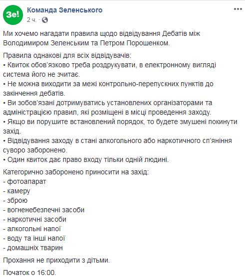 В Зе-команде попросили не приходить на дебаты с животными, детьми и наркотиками