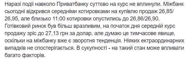 "Сейчас события вокруг Приватбанка существенно на курс не повлияли. Межбанк сегодня открылся средними котировками на покупку - продажу 26,85 / 26,95 грн/$1, но около 11:00 котировки опустились до 26,86/26,90 грн/$1. Наличный рынок был более уязвимым, на начало дня средний курс продажи вырос до 27,13 грн/$1, но думаю, это временное явление, поскольку на межбанке уже есть обратная тенденция. Никаких экстраординарных случаев не наблюдается", - написал он на своей странице в сети Facebook в пятницу.