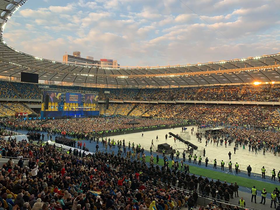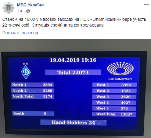 Сегодня, 19 апреля, на стадионе "Олимпийский" состоялись дебаты кандидатов в президенты Петра Порошенко и Владимира Зеленского. Несмотря на ожидаемое количество людей в 60 тысяч человек, пресс-служба МВД отчиталась о 22 тысячах находившихся на трибунах зрителях.