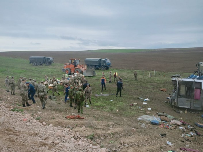 Автомашина марки Toyota Camry столкнулась с припаркованным вдоль дороги грузовиком. Следовавший по трассе пассажирский автобус, избегая столкновения с вышеуказанными транспортными средствами, опрокинулся, рассказал Ораз. На место происшествия выехало руководство области, прокурор, начальники областных департаментов полиции, по чрезвычайным ситуациям и управления по делам обороны. В аварийно-спасательных работах задействованы порядка 50 человек и 15 единиц техники оперативно-спасательных служб, медицины катастроф и медполиции области, а так же вертолетная техника "Казавиаспас", отметил он.
