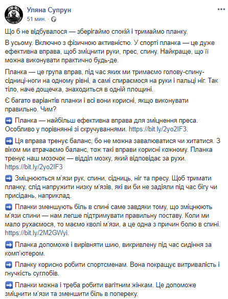"Что бы ни происходило - сохраняем спокойствие и держим планку. Во всем. Включая физическую активность. В спорте планка - это очень эффективное упражнение для укрепления рук, пресса, спины", - написала Супрун.