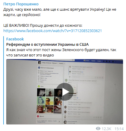 В субботу, 20 апреля, в день тишины перед вторым туром выборов, когда в Украине по закону запрещена любая агитация, на официальном Telegram-канале Петра Порошенко появилась ссылка на видео. На нем заснят пост Елены Зеленской на Facebook о том, что она якобы собирает данные о передвижении украинской армии.