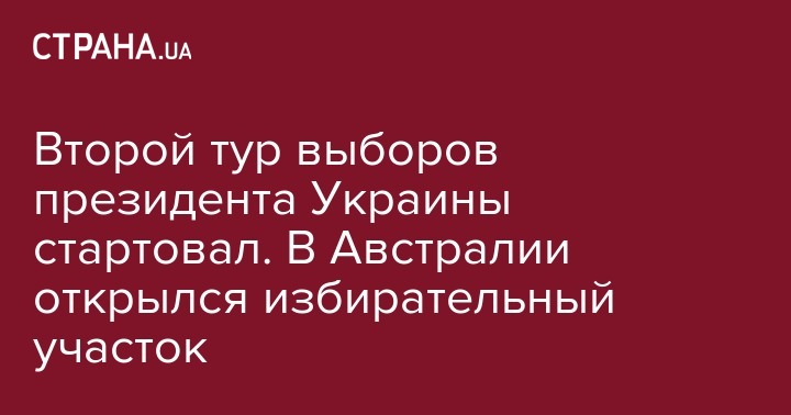 Отмечается, что первыми свои голоса за нового главу государства начали отдавать избиратели, зарегистрированные в Австралии и Новой Зеландии. Избирательный участок, созданный  при посольстве Украины в столице Австралии Канберре, открылся в 08:00 по местному времени (23:00 по киевскому времени 20 апреля). Голосование на нем продлится до 20:00 (11:00 по киевскому времени 21 апреля).