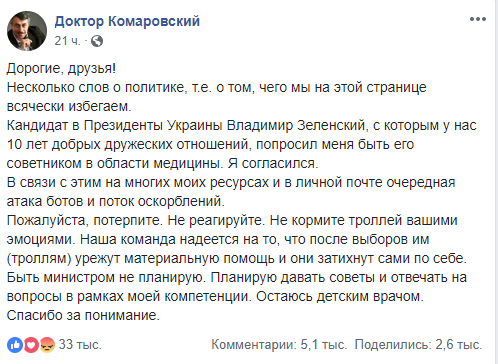 "Пожалуйста, потерпите. Не реагируйте. Не кормите троллей вашими эмоциями. Наша команда надеется на то, что после выборов им (троллям) урежут материальную помощь и они затихнут сами по себе. Быть министром не планирую. Планирую давать советы и отвечать на вопросы в рамках моей компетенции. Остаюсь детским врачом", - написал Комаровский в соцсети.
