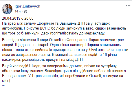 Три человека погибли и двое госпитализированы в результате ДТП, которое произошло 20 апреля в 20:00 между селами Дбрячин и Завишень (Сокальський район, Львовская область).