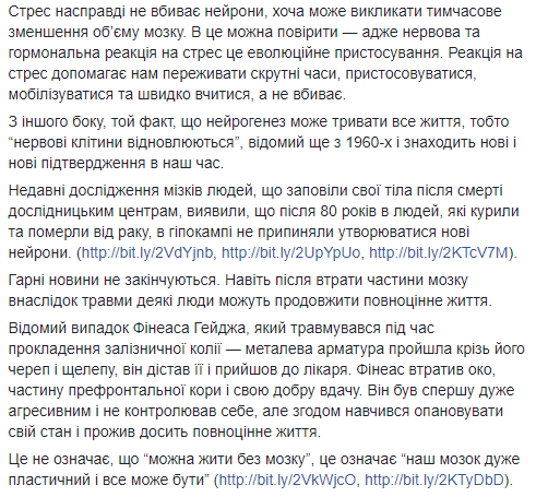 "Стресс на самом деле не убивает нейроны, хотя может вызвать временное уменьшение объема мозга. В это можно поверить - ведь нервная и гормональная реакция на стресс - это эволюционное приспособление. Реакция на стресс помогает нам переживать трудные времена, приспосабливаться, мобилизоваться и быстро учиться, а не убивает. С другой стороны, тот факт, что процесс образования нейронов может длиться всю жизнь, то есть "нервные клетки восстанавливаются", известен еще с 1960-х и находит новые и новые подтверждения в наше время", - отметила она.