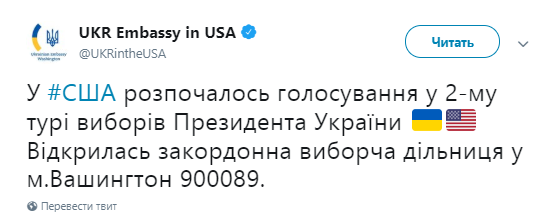 "В США началось голосование во 2-м туре выборов Президента Украины. Открылся заграничный избирательный участок в столице Вашингтон 900089", - сказано в сообщении.
