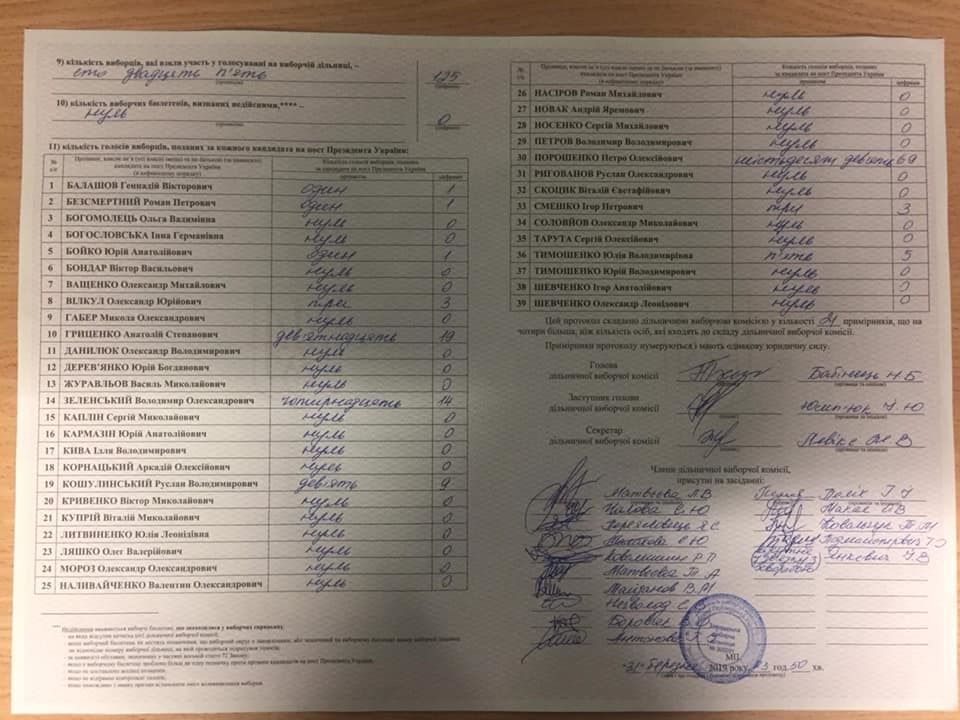 Результаты первого тура президентских выборов Украины на участке в Австралии. Фото: Facebook/ Посольство України в Австралії / Embassy of Ukraine in Australia
