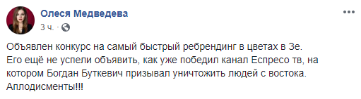 "Объявлен конкурс на самый быстрый ребрендинг в цветах в Зе. Его ещё не успели объявить, как уже победил канал Еспресо тв, на котором Богдан Буткевич призывал уничтожить людей с востока. Аплодисменты!!!", - написала на своей странице в Facebook ведущая блога ЯсноПонятно на "Стране" Олеся Медведева.
