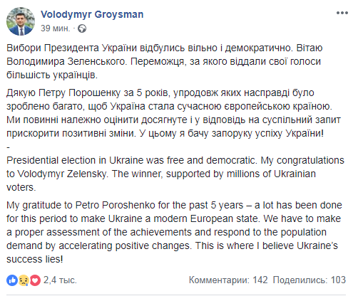 Выборы президента Украины состоялись свободно и демократично. Поздравляю Владимира Зеленского. Победителя, за которого отдали свои голоса большинство украинцев", - написал Владимир Гройсман.