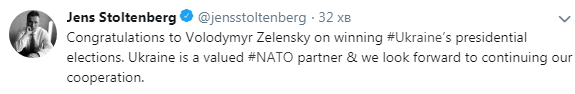 "Поздравляю Владимира Зеленского с победой на президентских выборах в Украине. Украина является ценным партнером НАТО, и мы с нетерпением ждем продолжения нашего сотрудничества", - говорится в его твиттер-микроблоге.