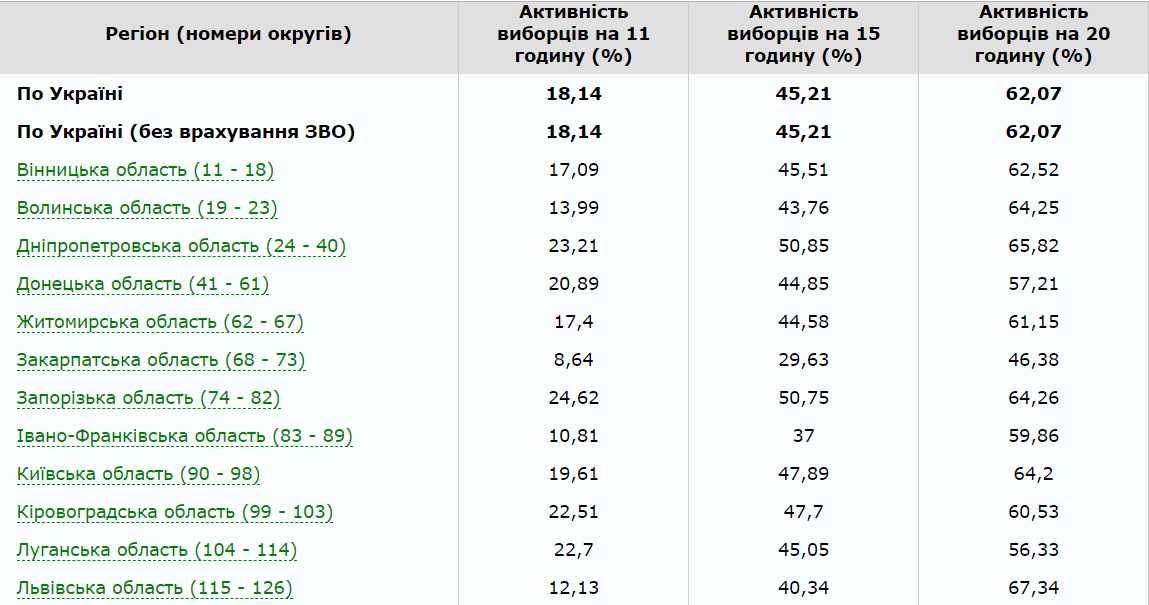 Самая низкая явка зафиксирована в Закарпатской области (46,38) и в Черновецкой области (54,09%).
