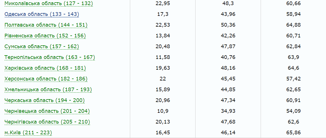 Одесская область показала явку 58,94%, Полтавская - 64,88%, Ровенская - 60,71%, Сумская - 62,84%, Тернопольская - 63,90%, Харьковская– 64,60%, Хмельницкая - 62,65%, Черкасская область - 60,91%, Черновицкая - 54,09%, Черниговская - 62,60%, Херсонская - 57,42%, г.Киев - 65,86%.