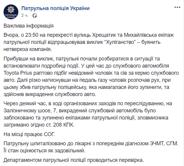 В ночь на понедельник в центре Киева на Крещатике мужчина проник в полицейский автомобиль и угнал его, сбив патрульную полицейскую, которая пыталась ему помешать. Об этом говорится на странице патрульной полиции Украины в социальной сети Facebook.