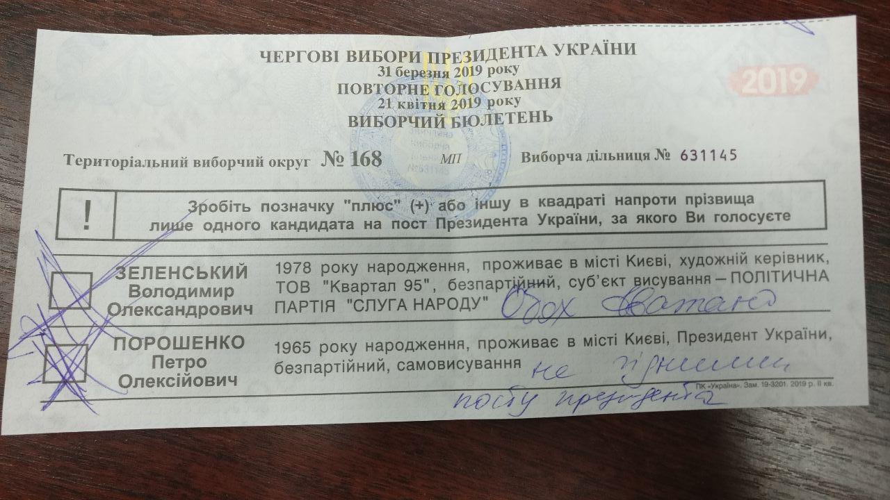 Отмечается, что избиратели на бюллетенях рисовали или выражали недовольство политикой. На одних украинцы дописывали графу "против всех", на других размашисто писали "Идите к черту" или просто черкали бюллетень. А на избирательном участке № 800635 в Подольском районе Киева один из бюллетеней был испачкан коричневым веществом.