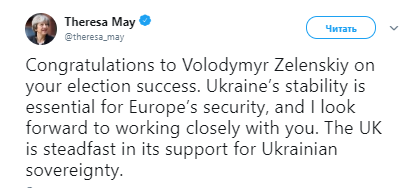"Поздравляю Владимира Зеленского с успехом на выборах. Стабильность Украины имеет важнейшее значение для безопасности Европы, и я рассчитываю на тесное сотрудничество с вами. Великобритания твердо поддерживает суверенитет Украины", - написала Тереза Мэй в своем микроблоге в соцсети Twitter.