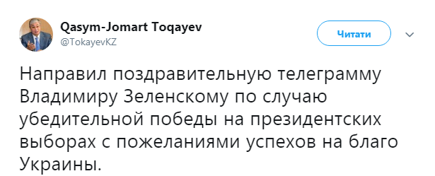 Президент Казахстана Касым-Жомарт Токаев поздравил Владимира Зеленского с победой на президентских выборах. Об этом говорится в Twitter-микроблоге казахского лидера.