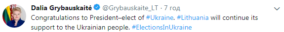 Президент Литвы Даля Грибаускайте заверила Владимира Зеленского в дальнейшей поддержке. "Поздравляю избранного президента Украины. Литва продолжит свою поддержку украинского народа", - говорится в опубликованном сообщении в твиттер-микроблоге президента Литвы.