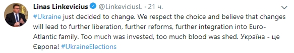 Министр иностранных дел Литвы Линас Линкявичюс в своем сообщении отметил, что Запад должен уважать выбор украинцев, и добавил по-украински: "Украина - это Европа!"