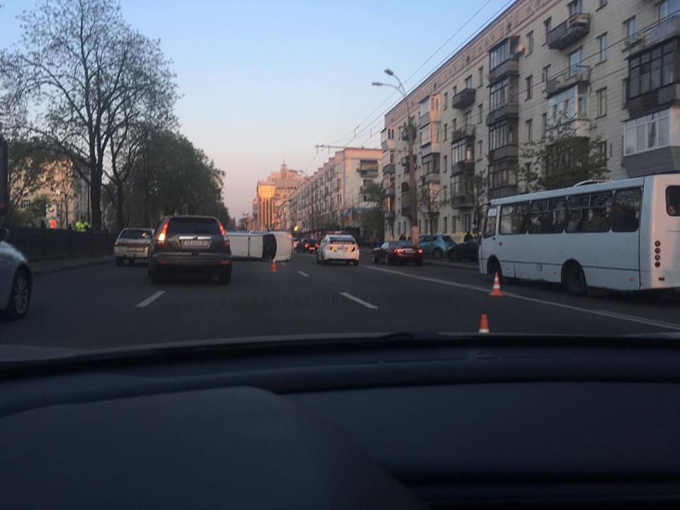 В понедельник, 22 апреля, в Киеве на проспекте Победы произошло ДТП. Посреди проезжей части перевернулся легковой автомобиль Renault. На место прибыл экипаж патрульной полиции для выяснения обстоятельств произошедшего.