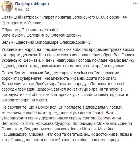 Патриарх Киевский и всей Руси-Украины Филарет поздравил Владимира Зеленского с избранием президентом Украины и призвал бороться с коррупцией и против российской агрессии.