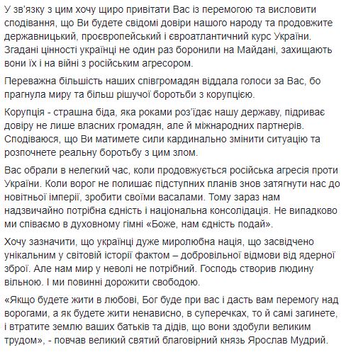 "Хочу искренне поздравить Вас с победой и выразить надежду, что Вы будете сознательные доверия нашего народа и продолжите государственный, проевропейский и евроатлантический курс Украины. Упомянутые ценности украинцы не раз защищали на Майдане, защищают они их и на войне с российским агрессором. Подавляющее большинство наших сограждан отдала голоса за Вас, потому что стремилась к миру и более решительной борьбы с коррупцией", - говорится в нем.