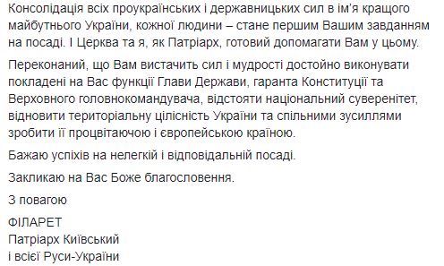 В частности, Филарет пожелал Зеленскому успехов на нелегком и ответственном посту.