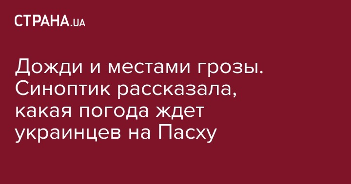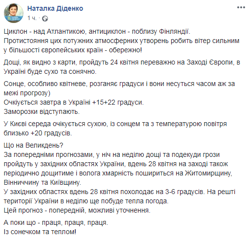 "Что на Пасху? По предварительным прогнозам, в ночь на воскресенье дожди и местами грозы пройдут в западных областях Украины, днем ​​28 апреля на западе периодически дождливо, сырая погода и облачность распространятся на Житомирскую, Винницкую и Киевскую области", - написала Наталья Диденко.