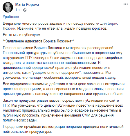Пресс-секретарь Бориса Ложкина Мария Попова опубликовала на своей странице в Facebook комментарий адвокатов бизнесмена, в котором речь шла о том, что анонсированные в медиа вызовы, повестки и прочие документы их клиенту направлены или вручены не были".