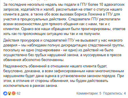 Адвокаты считают дело политически мотивированными. Также отмечается, что в ГПУ не сообщили о вызове их клиента в ответах на более 10 адвокатских запросов и ходатайств о статусе Ложкина в деле. На них в принципе не было получено ответа.