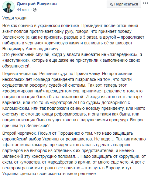 Все как обычно в украинской политике. Президент после оглашения экзит-поллов протягивает одну руку, говоря, что признаёт победу Зеленского (а как не признать, разрыв в 3 раза), а другой – продолжает набирать в черпачок коричневую жижу и выливать её за шиворот Владимиру Александровичу.