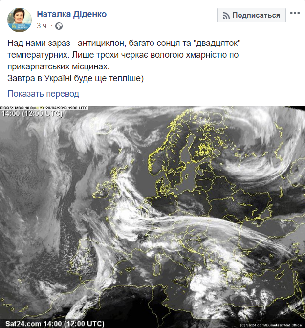 Ранее Диденко сообщила, что 24 апреля в Украине будет царить сухая и солнечная погода с приятной весенней температурой воздуха выше +15 градусов.