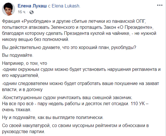 "Когда Порошенко узурпировал власть и фактически подчинил себе парламент, у Сыроид не возникало желание ограничить его функции? Ее устраивал беспредел Президента? Я сейчас хочу обратить внимание всех моих читателей и друзей на то, что Система будет отчаянно сопротивляться нашему выбору. Их, конечно, не 25%. От силы-5. Остальные- просто больные люди. Но вот эти 5%- это те, кто привык за все годы "независимости" нас обворовывать, прикрываясь красивыми лозунгами о стратегическом курсе, Томосе, унитарности, соборности... Одеваясь в вышиванки, выкрикивая "Слава Украине" и "понад усе", надрывно исполняя Гимн и укутываясь в наш, украинский флаг. Они сидят в Раде, кабмине, администрации президента, в теневом правительстве, в СБУ, прокуратуре, в местных органах власти... Это не только БПП и НФ. Это "Самонемочь", "Радикалы" и остальные парламентские фракции и партии. Это все, кто связан между собой деньгами, договорняками, откатами, взятками и т.д. Все, кто будет голосовать законы, ограничивающие полномочия нового Президента, которого мы выбрали прежде всего, чтобы получить ответ на главный запрос общества: на справедливость, верховенство права и неотвратимость наказания.