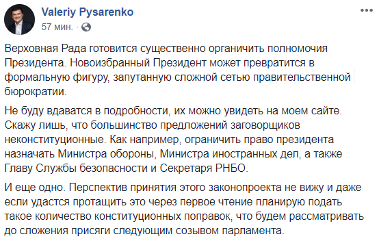 И еще одно. Перспектив принятия этого законопроекта не вижу и даже если удастся протащить это через первое чтение планирую подать такое количество конституционных поправок, что будем рассматривать до сложения присяги следующим созывом парламента", - заявил Писаренко.