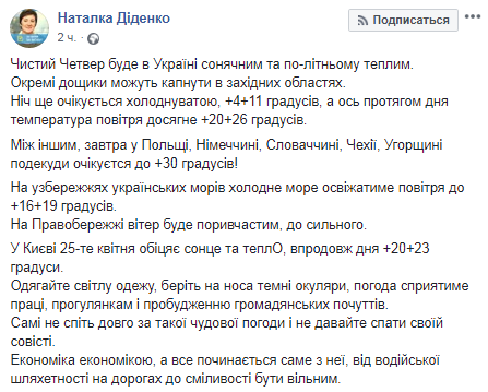 Чистый четверг, 25 апреля, в Украине будет солнечным и по-летнему теплым днем. Об этом написала синоптик Наталья Диденко на своей странице в Facebook.