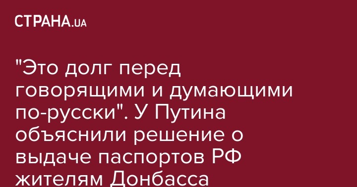 "Это долг России перед говорящими и думающими по-русски людьми, которые сейчас оказались в очень тяжелой ситуации из-за репрессивных действий киевского режима", - добавил помощник российского лидера.