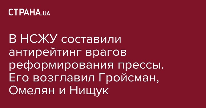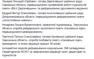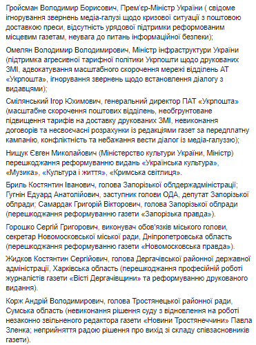 "В список должностных лиц или политиков, которые препятствуют разгосударствлению газет, вошли как представители местных органов власти, так и столичные топ-чиновники. В частности, в антирейтинг включен премьер-министр, министр инфраструктуры, министр культуры и гендиректор АО "Укрпочта". Соответствующий список "врагов реформирования прессы" утвержден на заседании Секретариата Национального союза журналистов Украины в среду 24 апреля", - пишет глава НСЖУ.