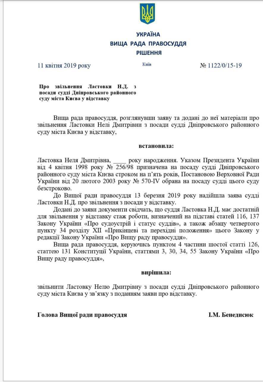 Высший совет правосудия по завершении своего заседания 30 января 2019 года решил, что "в действиях судьи Днепровского районного суда города Киева Ластовки Н.Д. констатировано нарушение, однако прекращено производство из-за истечения срока привлечения к дисциплинарной ответственности".