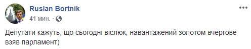 Политический эксперт Руслан Бортник шутит: "Депутаты говорят, что сегодня осел, груженый золотом, в очередной раз взял парламент".