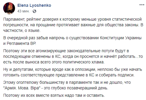 Юрист, блогер Елена Лешенко: "Парламент, рейтинг доверия к которому меньше уровня статистической погрешности, на прощание протягивает важные для общества законы. В частности, о языке. В очередной раз забыв напрочь о существовании Конституции Украины и Регламента ВР.